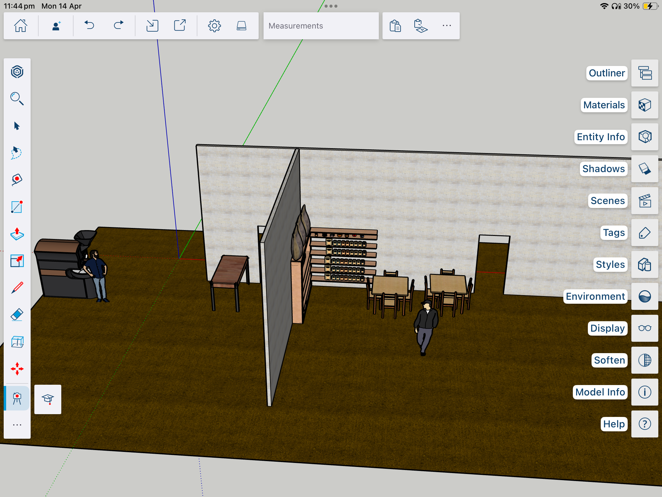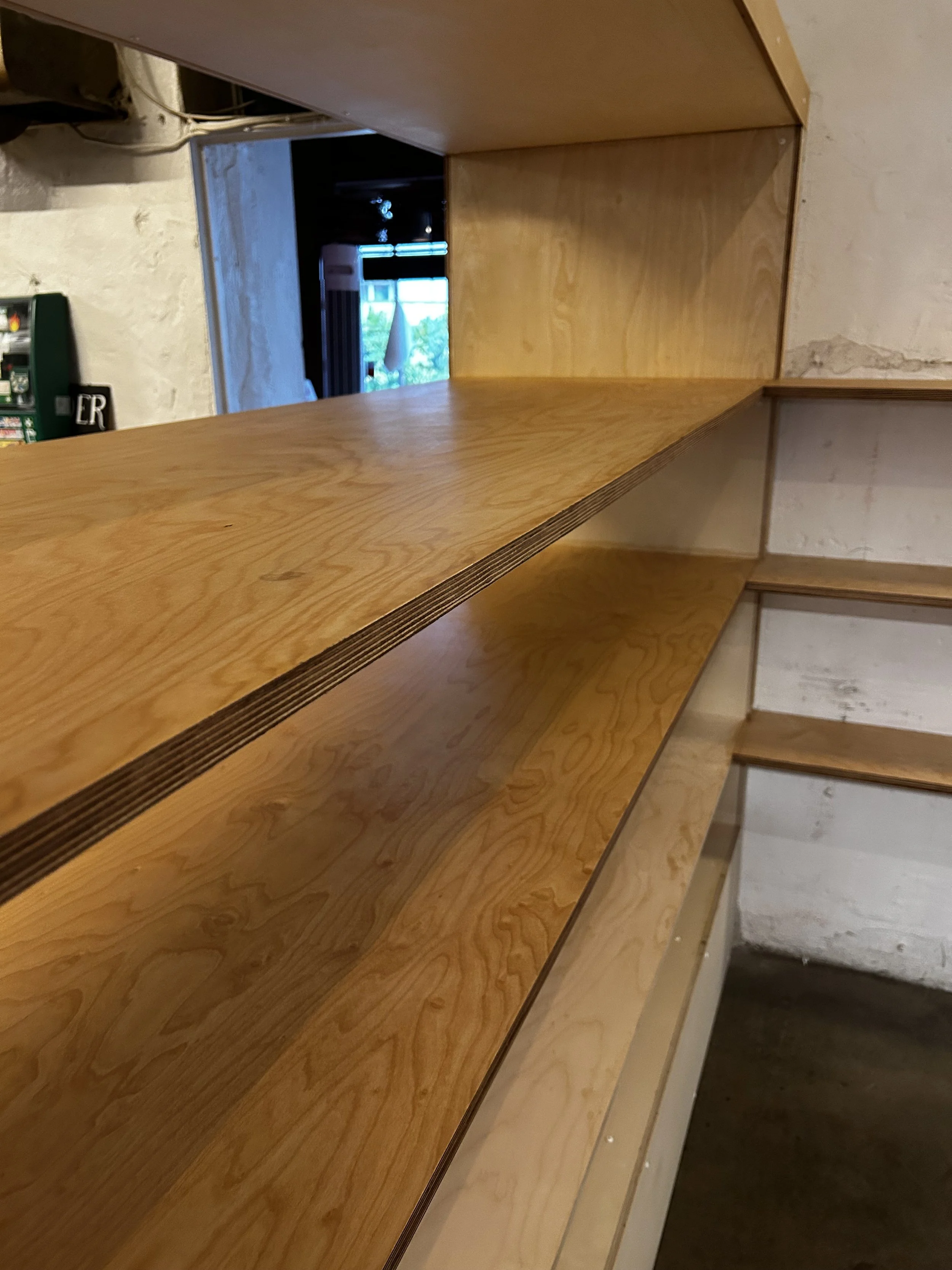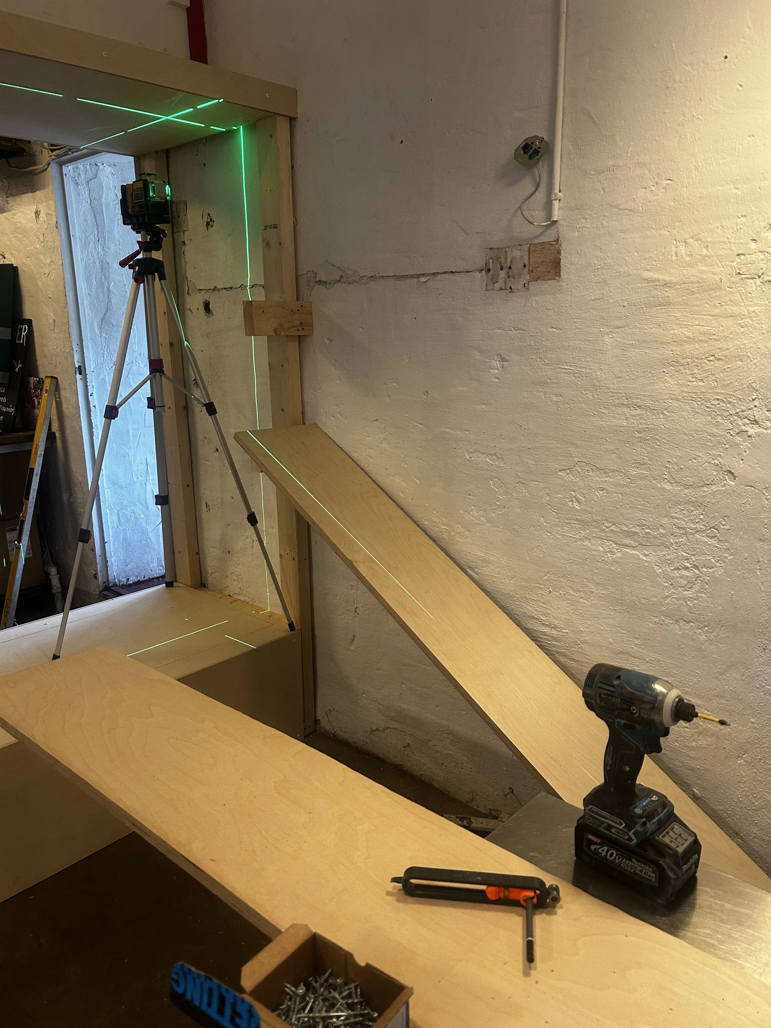 Kombinasjon av dør, gulvhylle og flytende hylle.