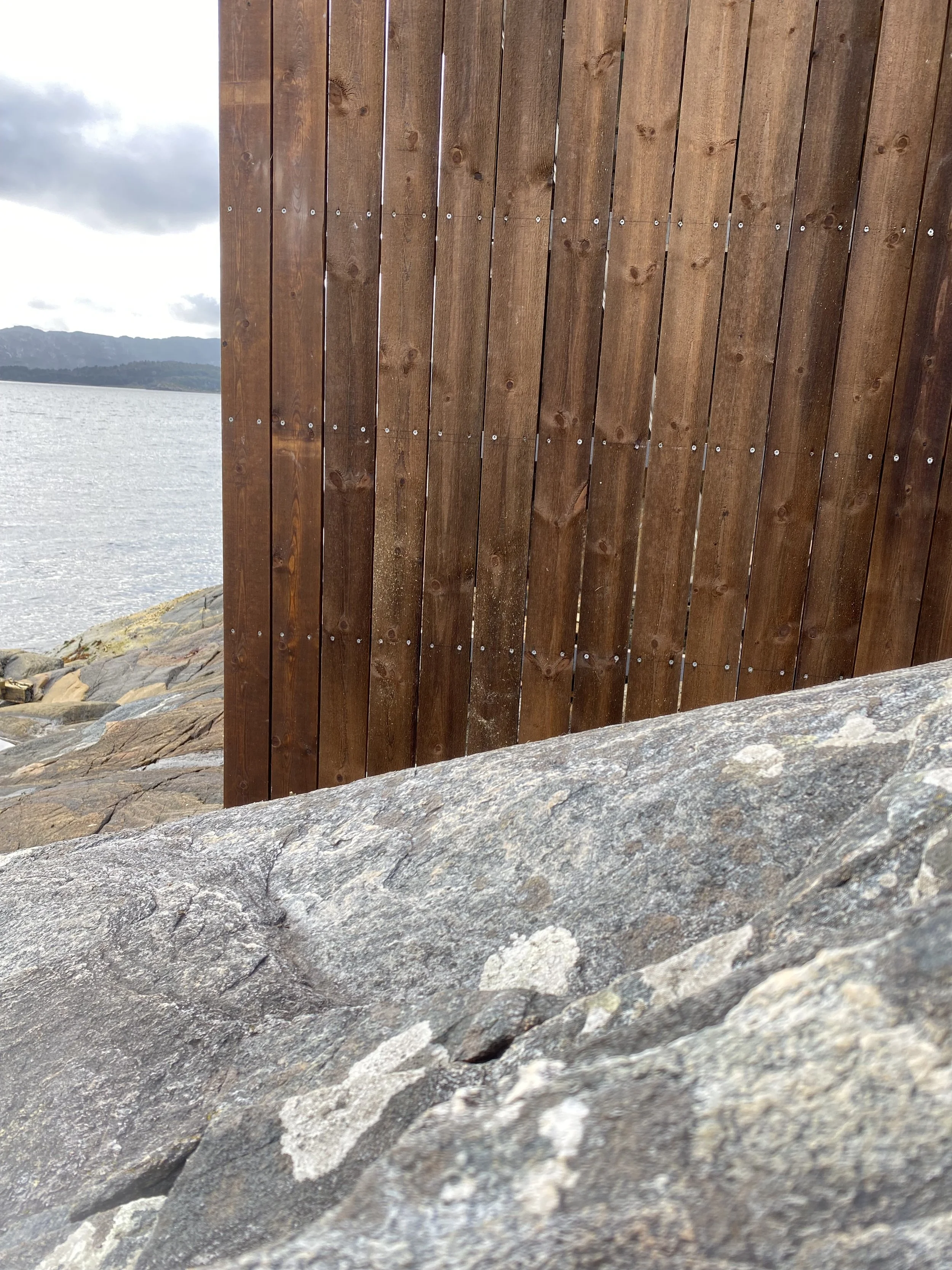 Moderne naust med minimalistisk design. Stående kledning som smelter nedi knausen. Dette naustet er utformet med fokus på minimalitisk estetik og praktisk funksjonalitet, og inkluderer to nivåer med plattinger som harmonisk knytter sammen naustet, knausen, sjøen og badstuen.
